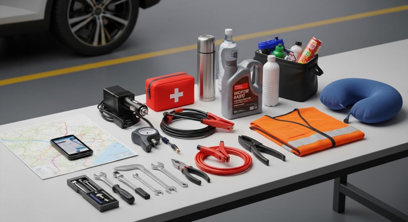 W apteczce powinny być podstawowe środki, leki przyjmowane na stałe oraz leki na niestrawność/chorobę lokomocyjną. W zestawie ratunkowym obowiązkowo muszą się znaleźć: trójkąt ostrzegawczy, kamizelki odblaskowe (dla każdego pasażera), zestaw naprawczy do opon lub kompresor, kable rozruchowe, latarka i linka holownicza.